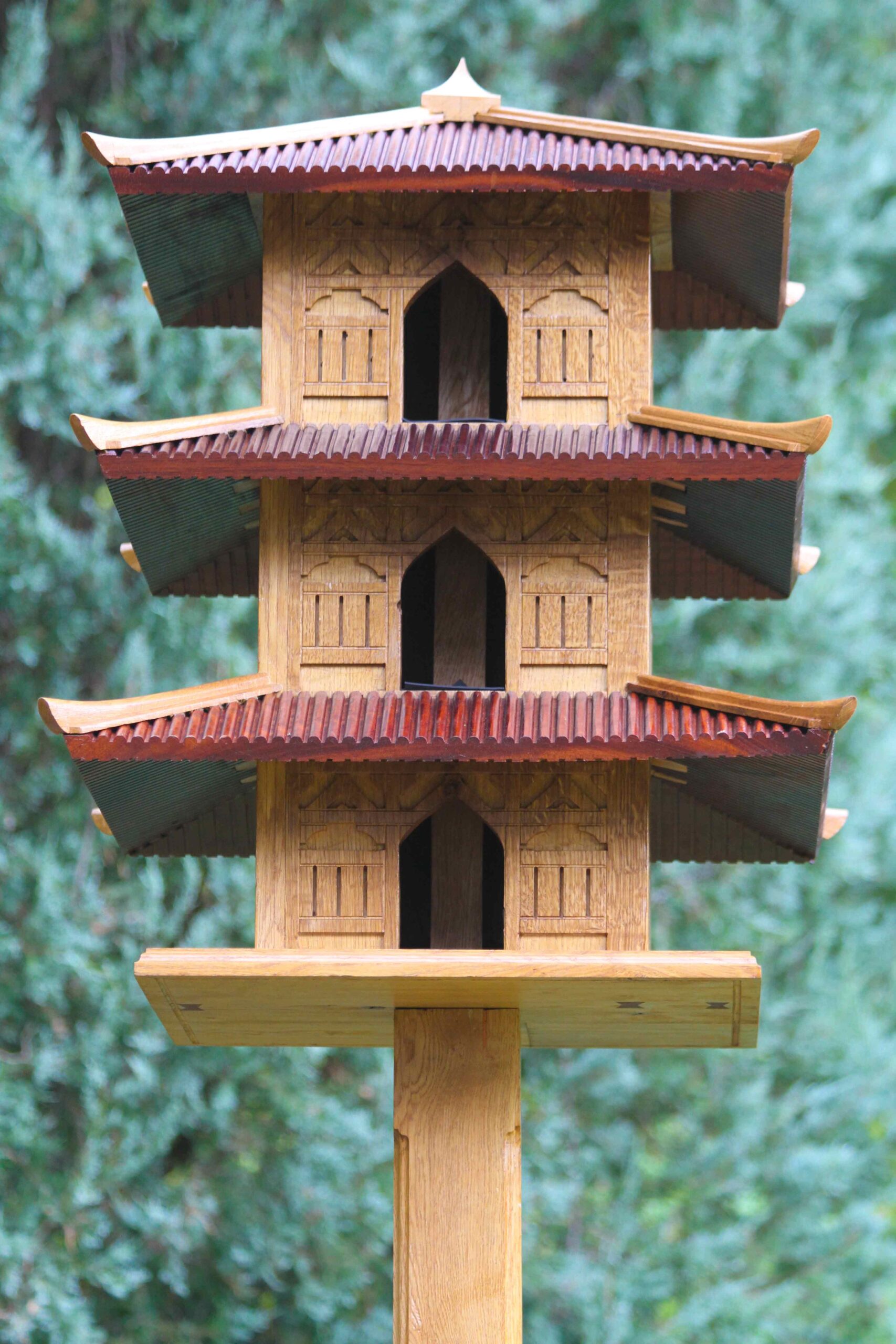 Hand built from genuine reclaimed European oak, American and African mahogany, this three-tier dovecote was inspired by Japanese pagoda design with beauty and functionality in mind.