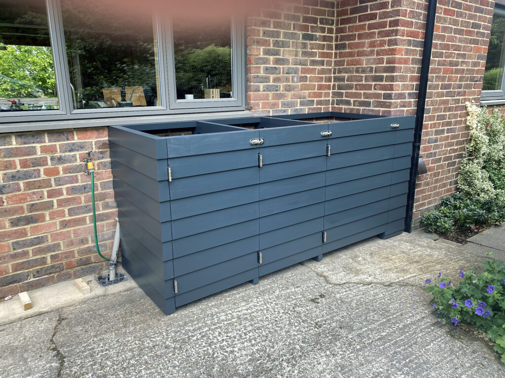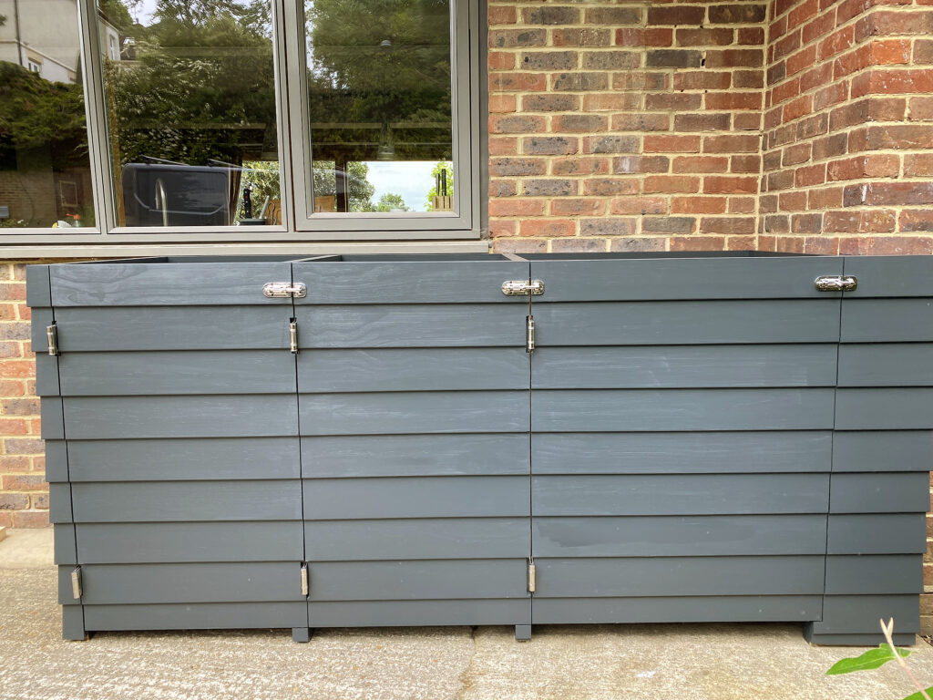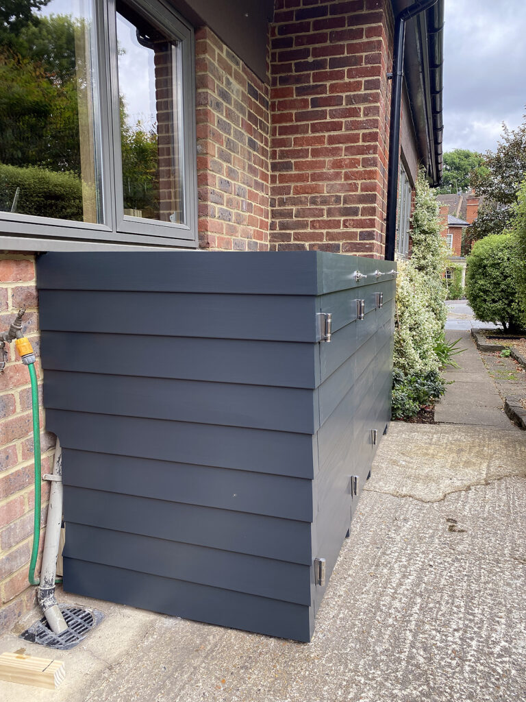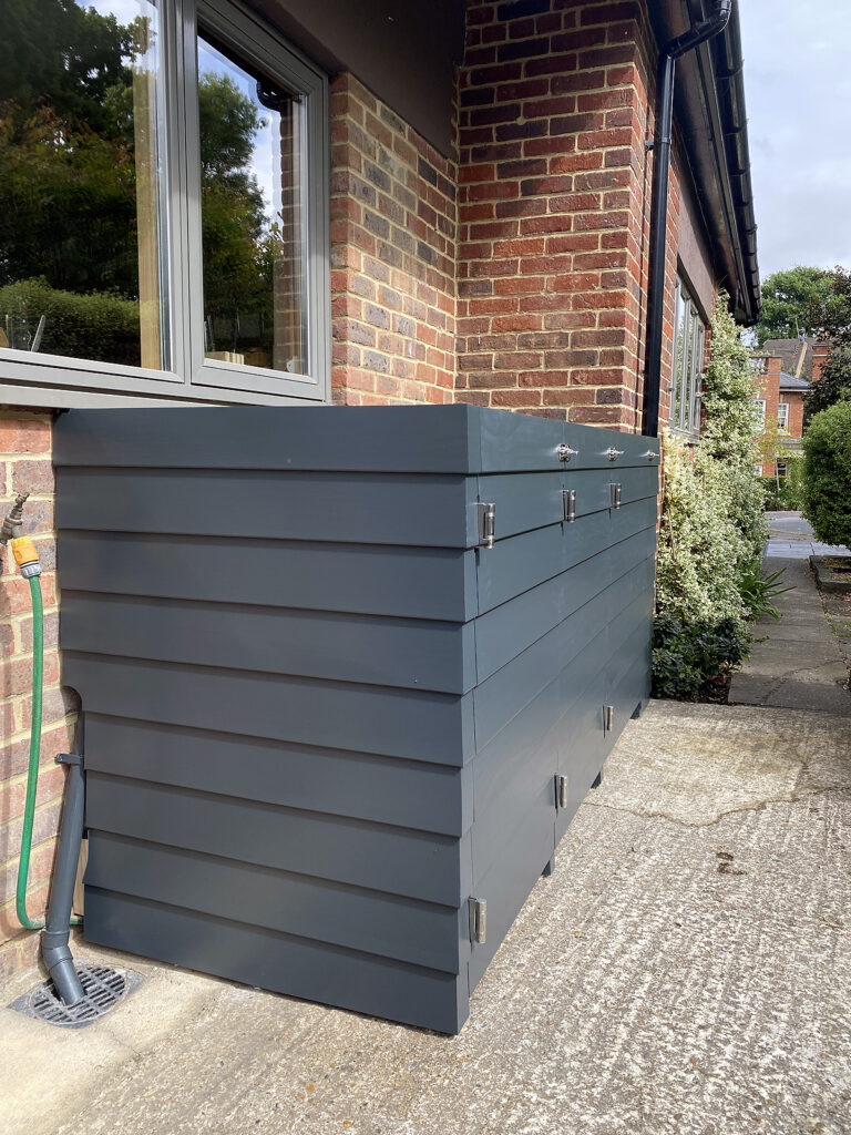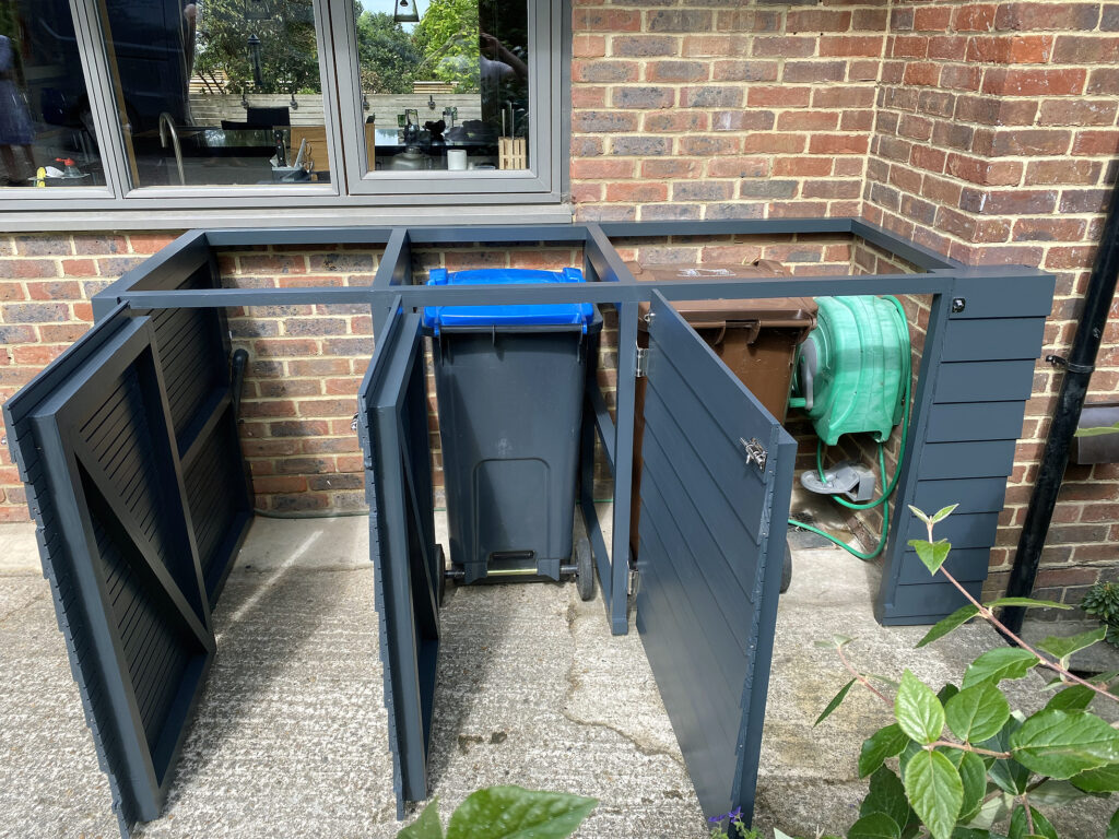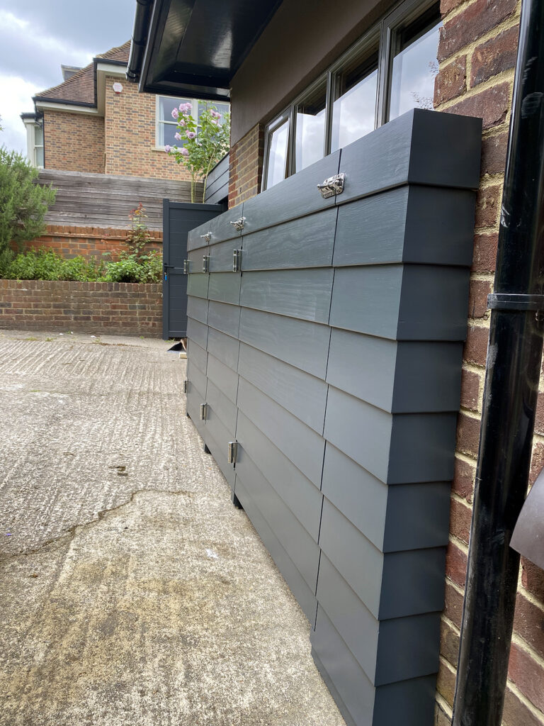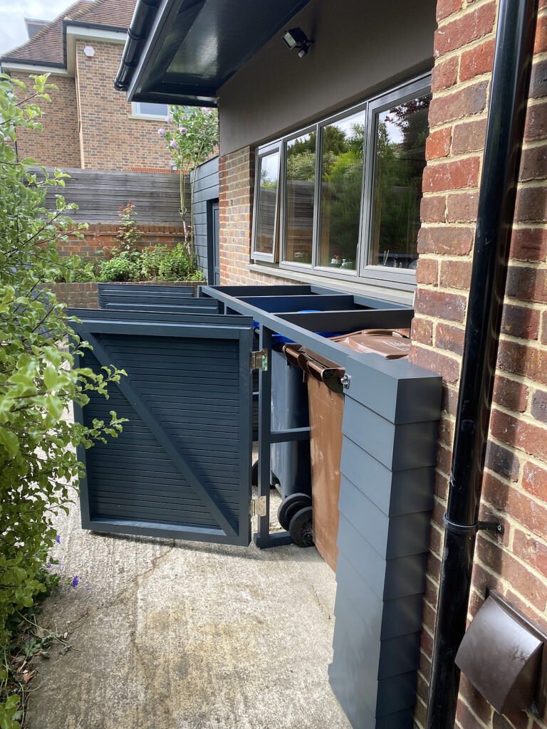 Accoya bin store bringing a tidy and stylish look to our client’s municipal bins – Accoya and stainless fittings for longevity, spray painted to reflect grey window framing around the property.