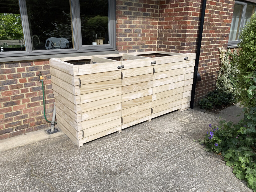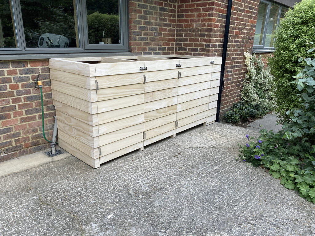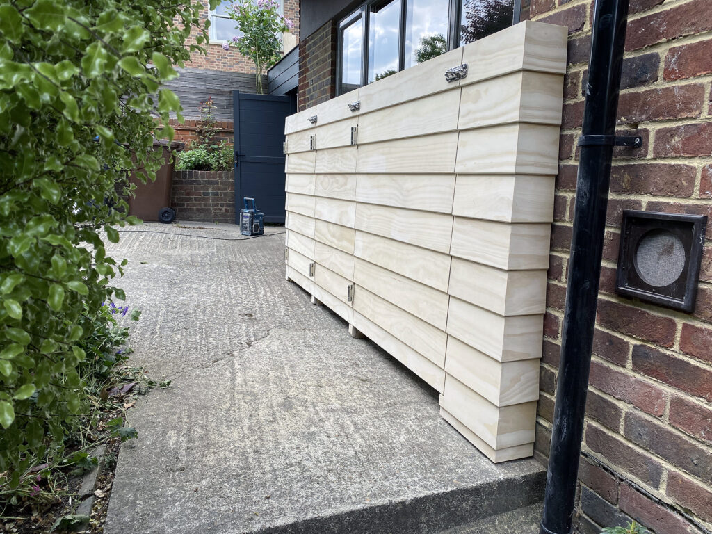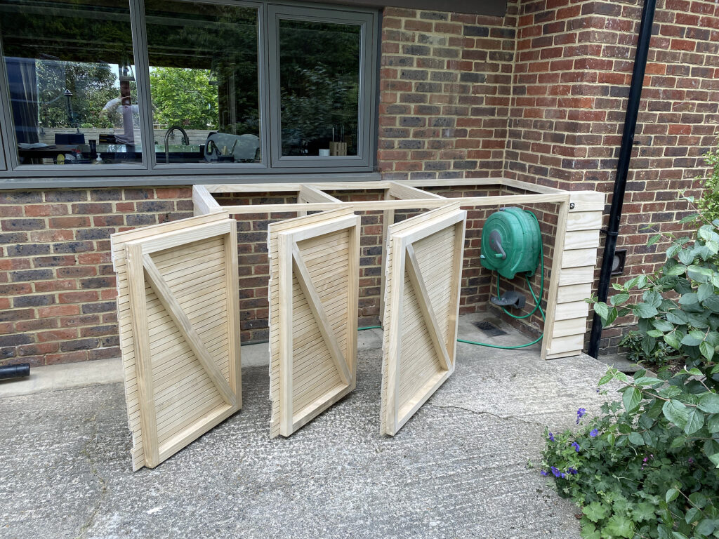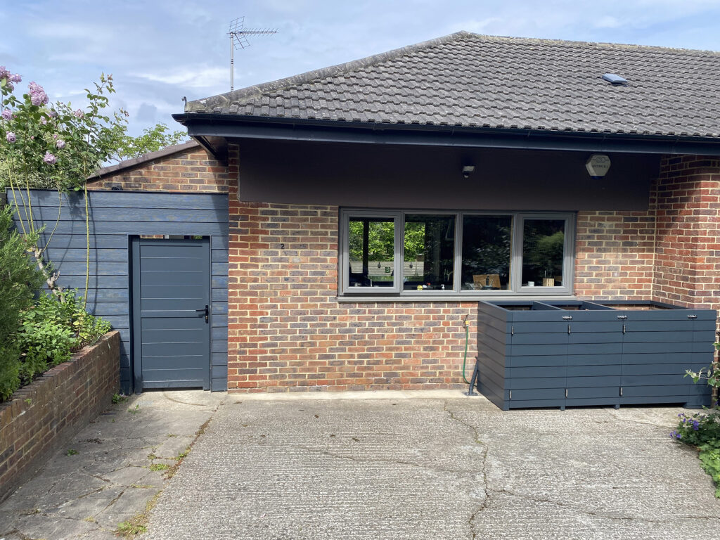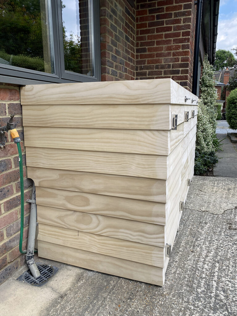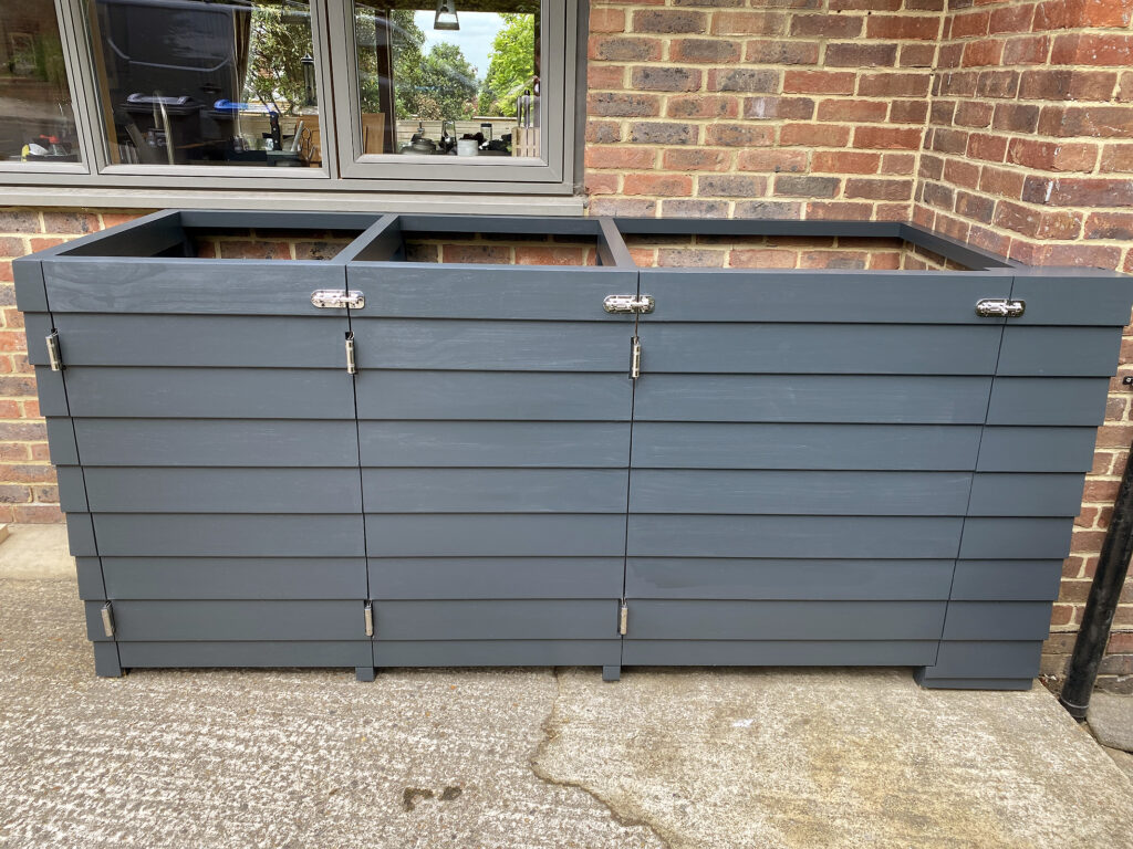 Accoya bin store bringing a tidy and stylish look to our client’s municipal bins – Accoya and stainless fittings for longevity, spray painted to reflect grey window framing around the property.