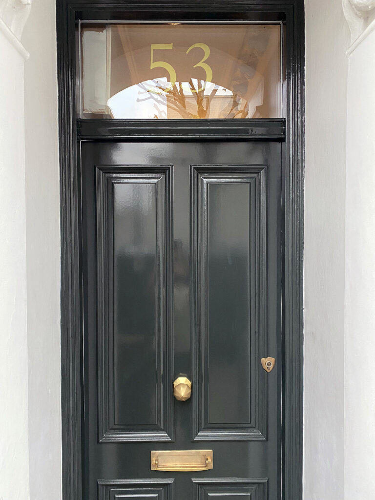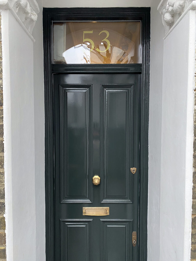 A classically styled, new front door installation, finished in dark green gloss with bespoke brass hardware. This elegant period entrance showcases our expert craftsmanship, timeless design, and luxury exterior renovation – perfect for classic London and heritage homes seeking refined curb appeal.”