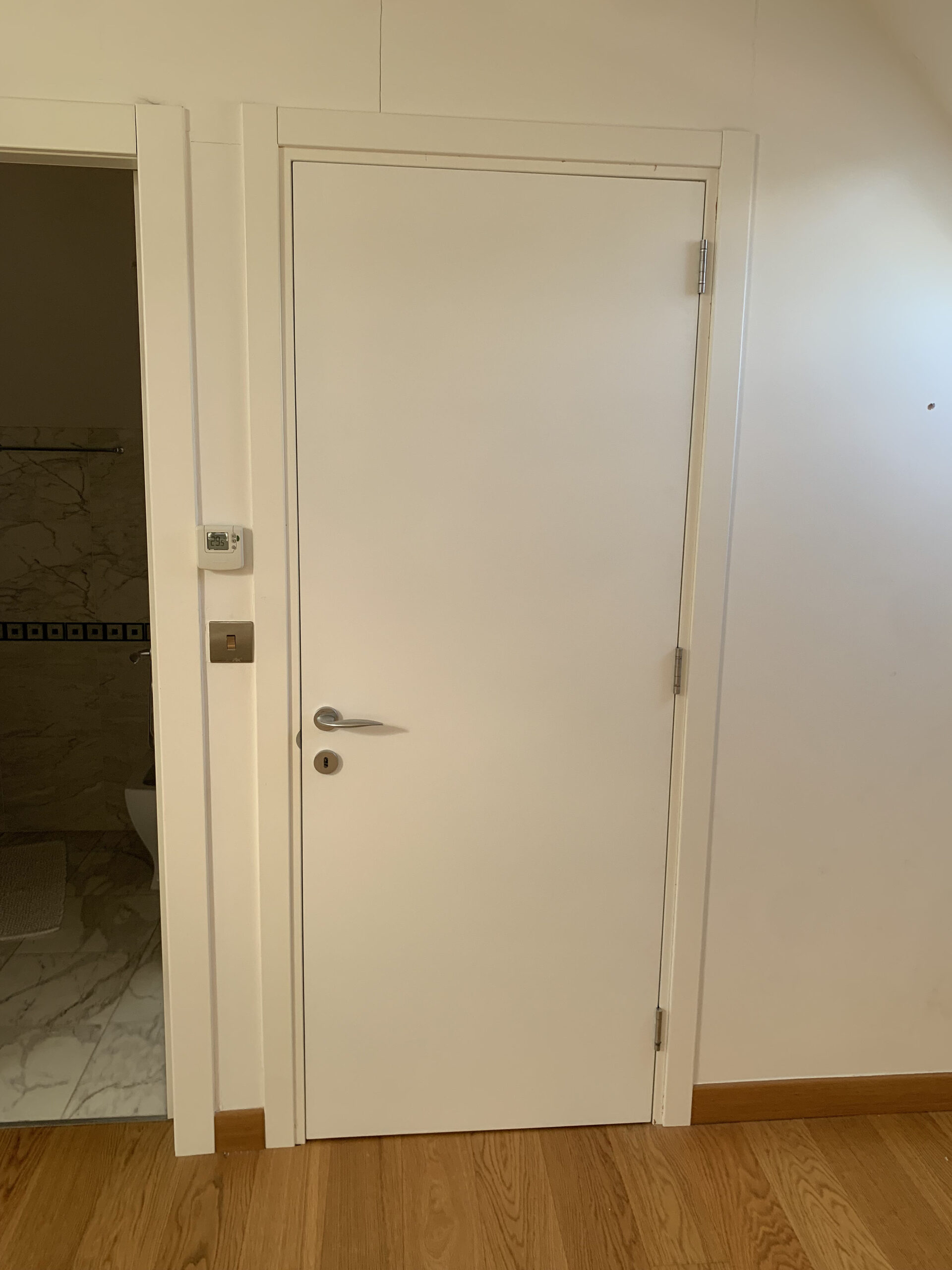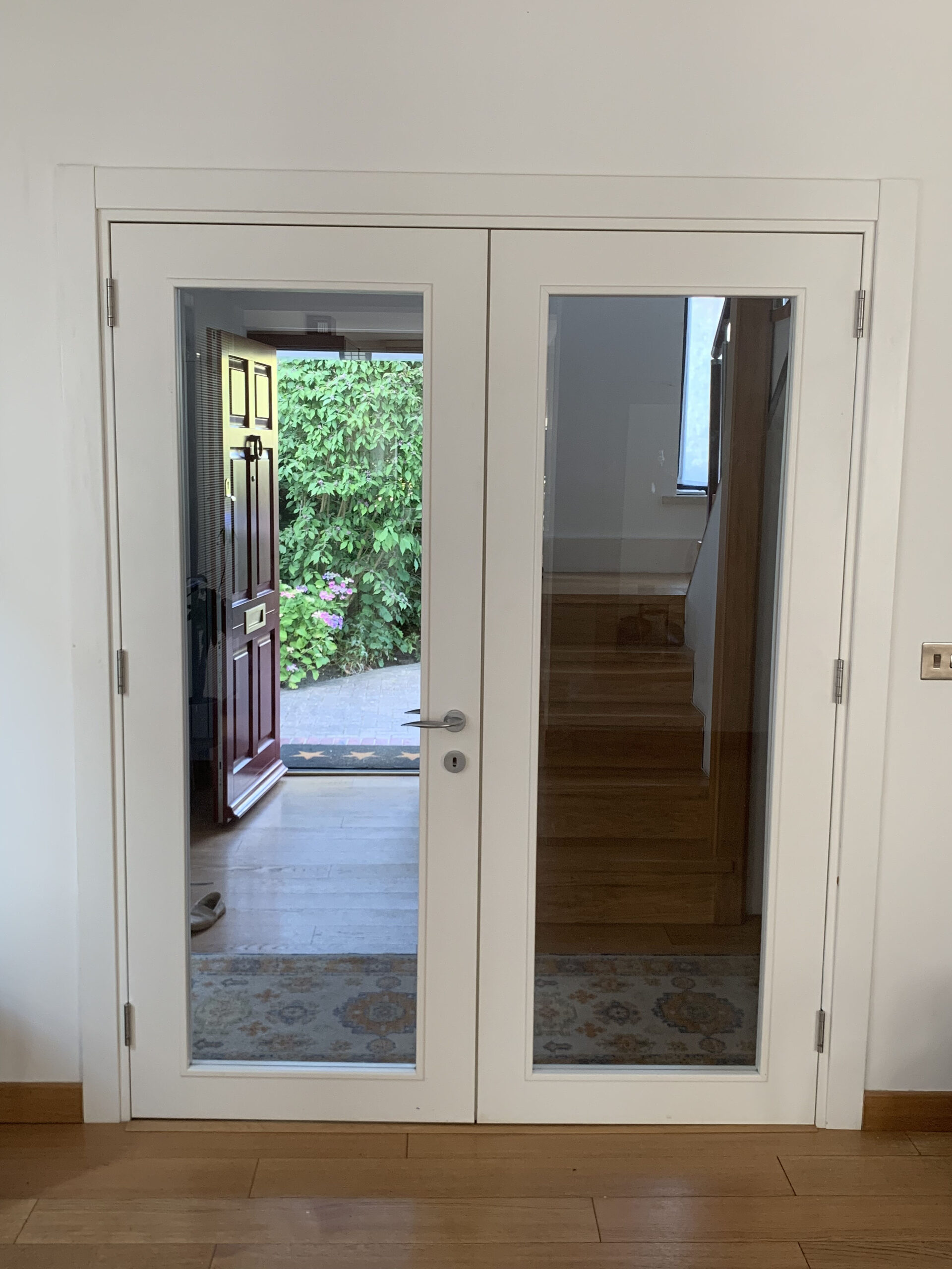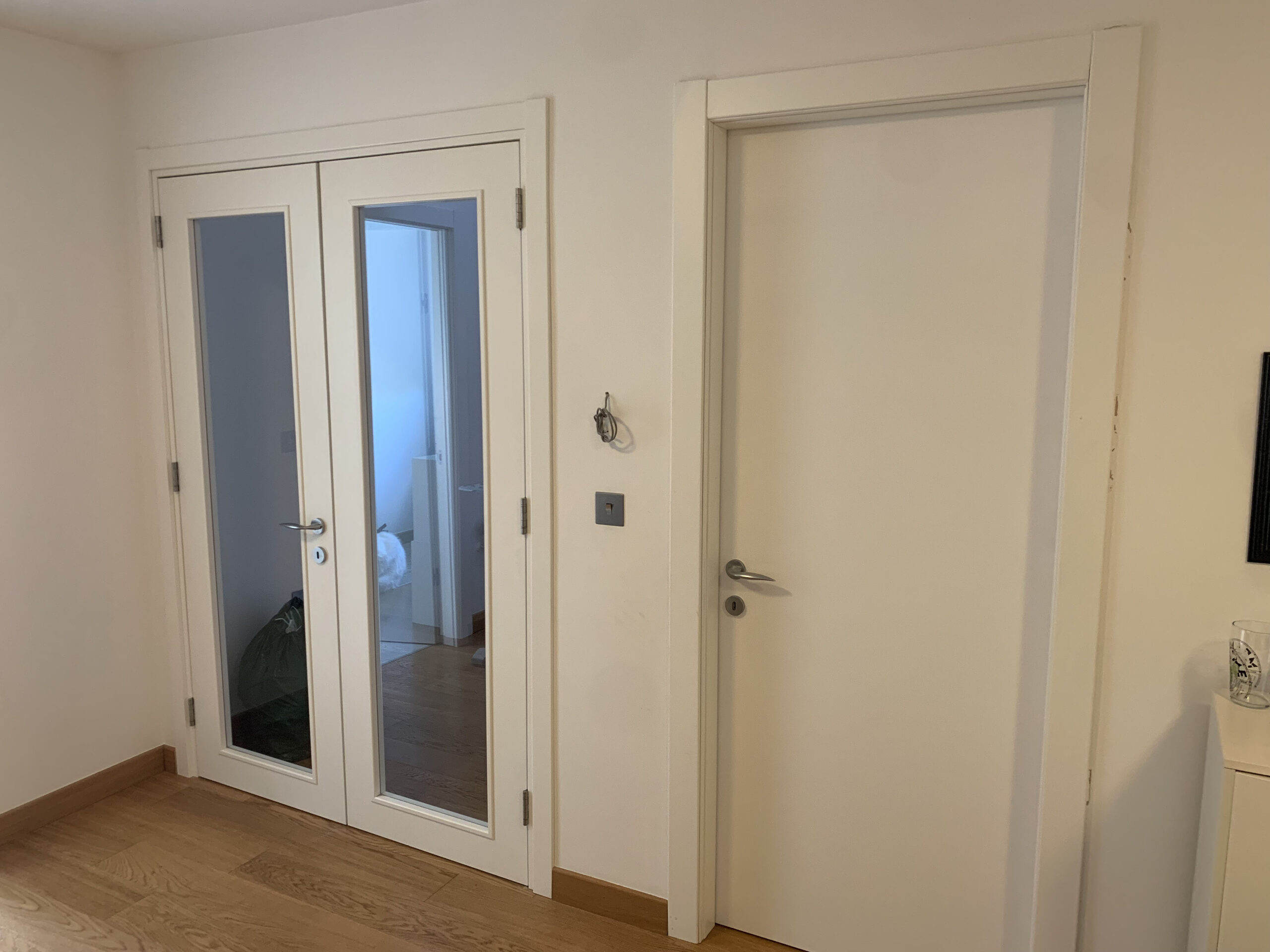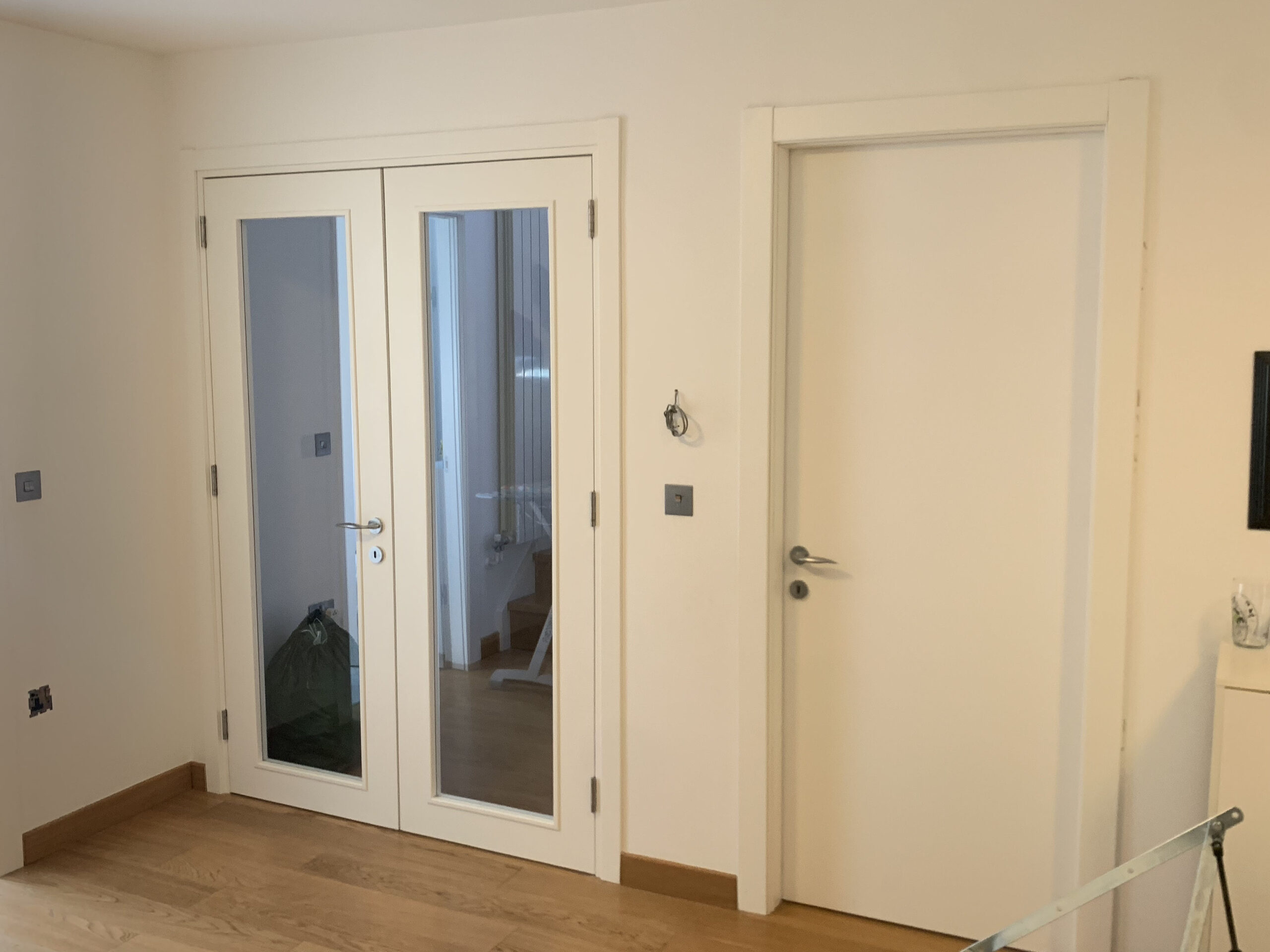 replacement modern style doors with new brushed stainless hinges, sprayed in a matt white.