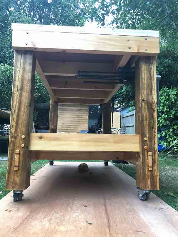 We used some old fenceposts for the legs which were planed back to get them smooth and square. The dark-greenish colour you see is the the original treatment the mill uses. We liked the way it highlighted the grain so didn’t see a need to plane any further.