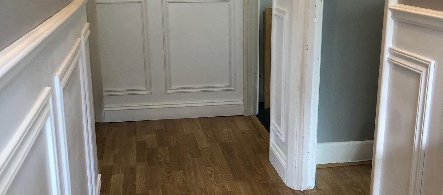 Wainscot wall panelling September 29, 2024 Bespoke Commissions, Household Carpentry, Joinery & Furniture Making Maple ply backed wainscot with dado and ogee skirting, sprayed in satin white. See more images from this project wainscotting wall panelling Older Post Shop front refit Newer Post Door fitting and spraying